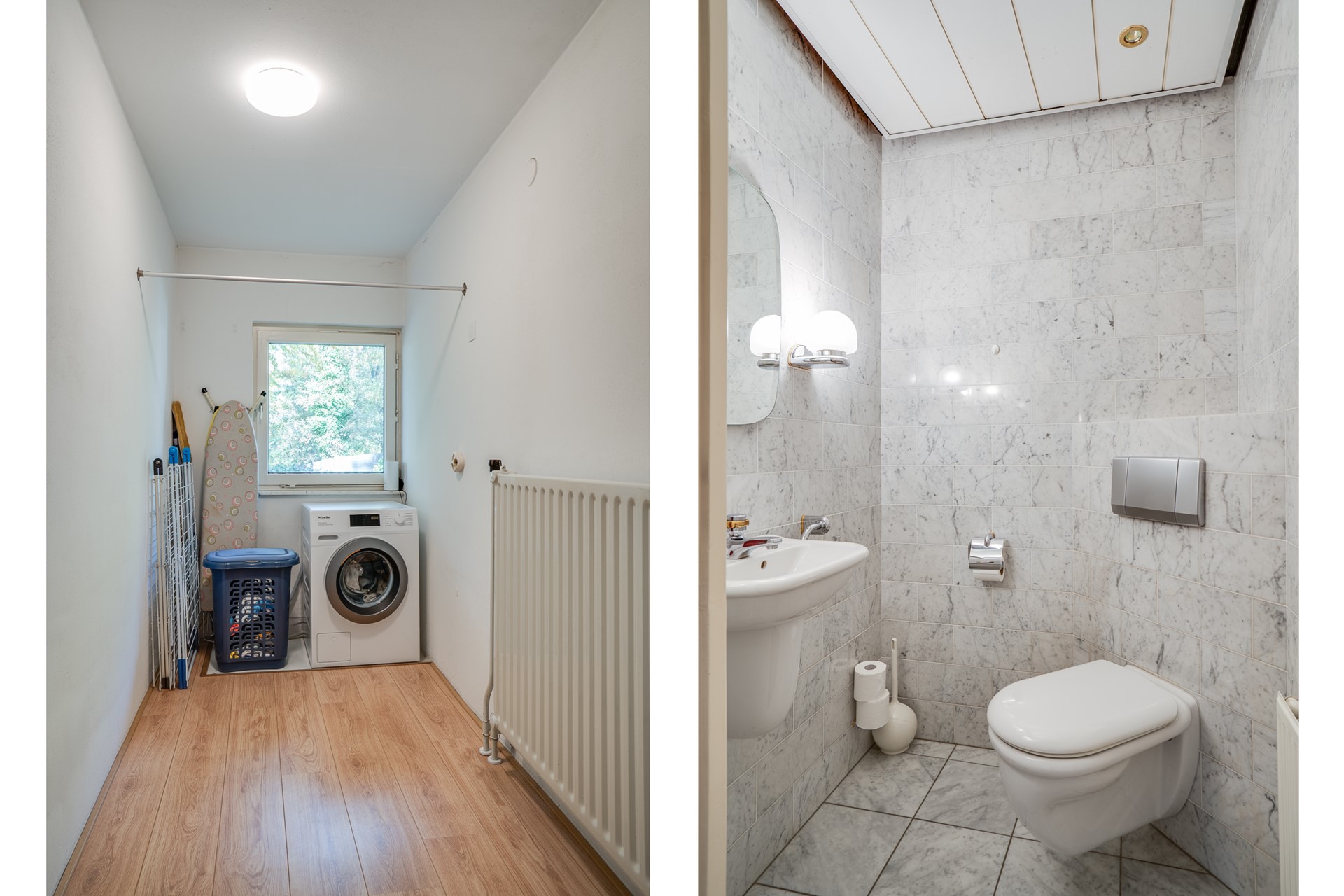 Vanuit de keuken loop je door naar de bijkeuken, een praktische handige ruimte. In de bijkeuken is de toegang naar de achtertuin.