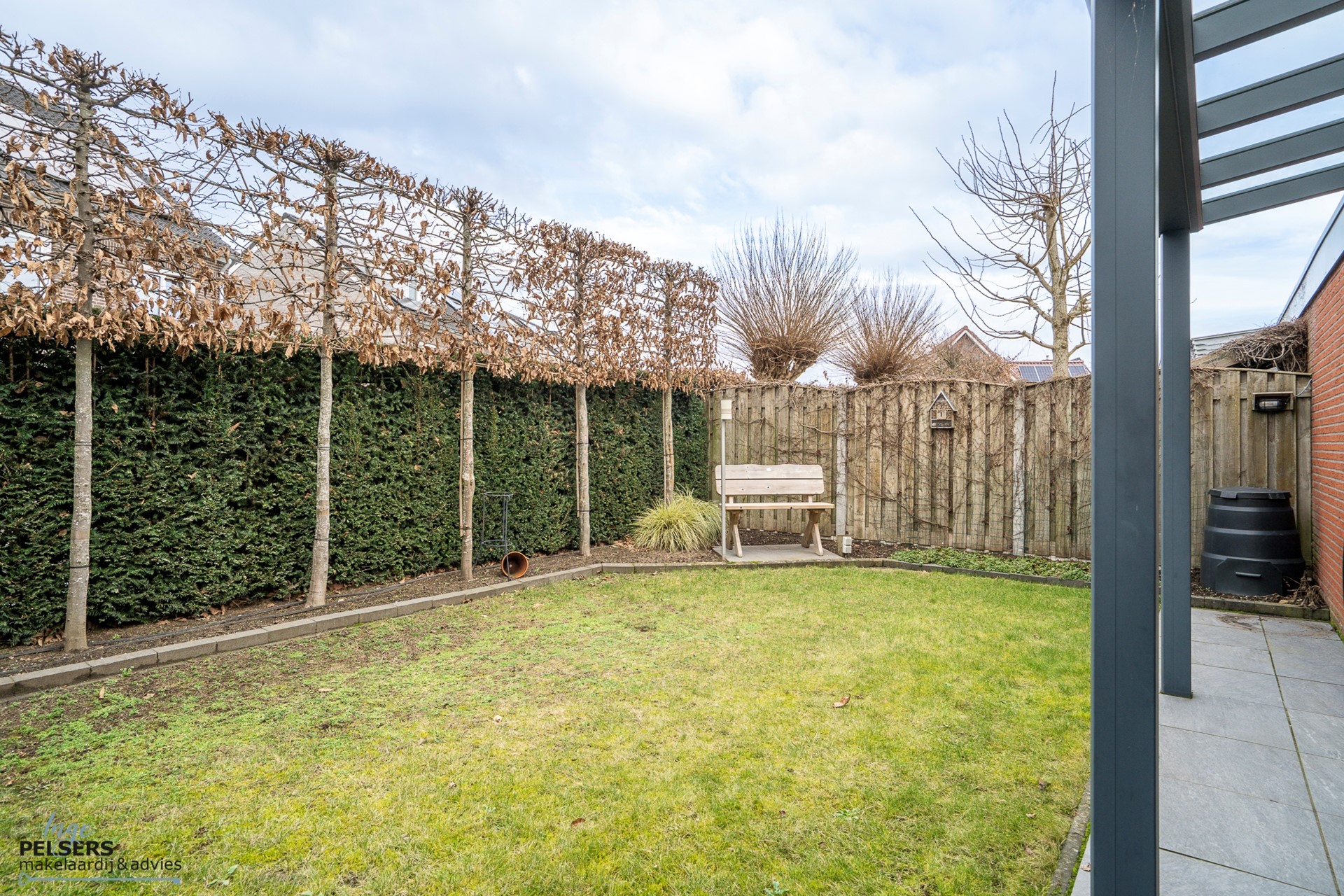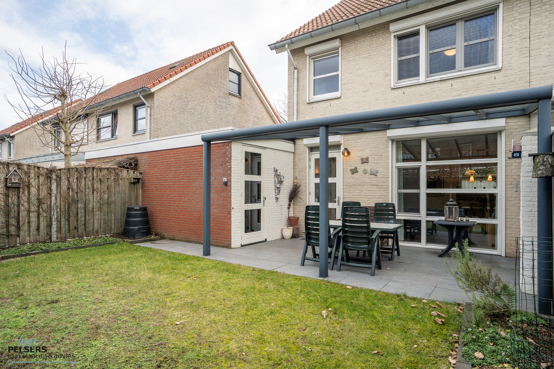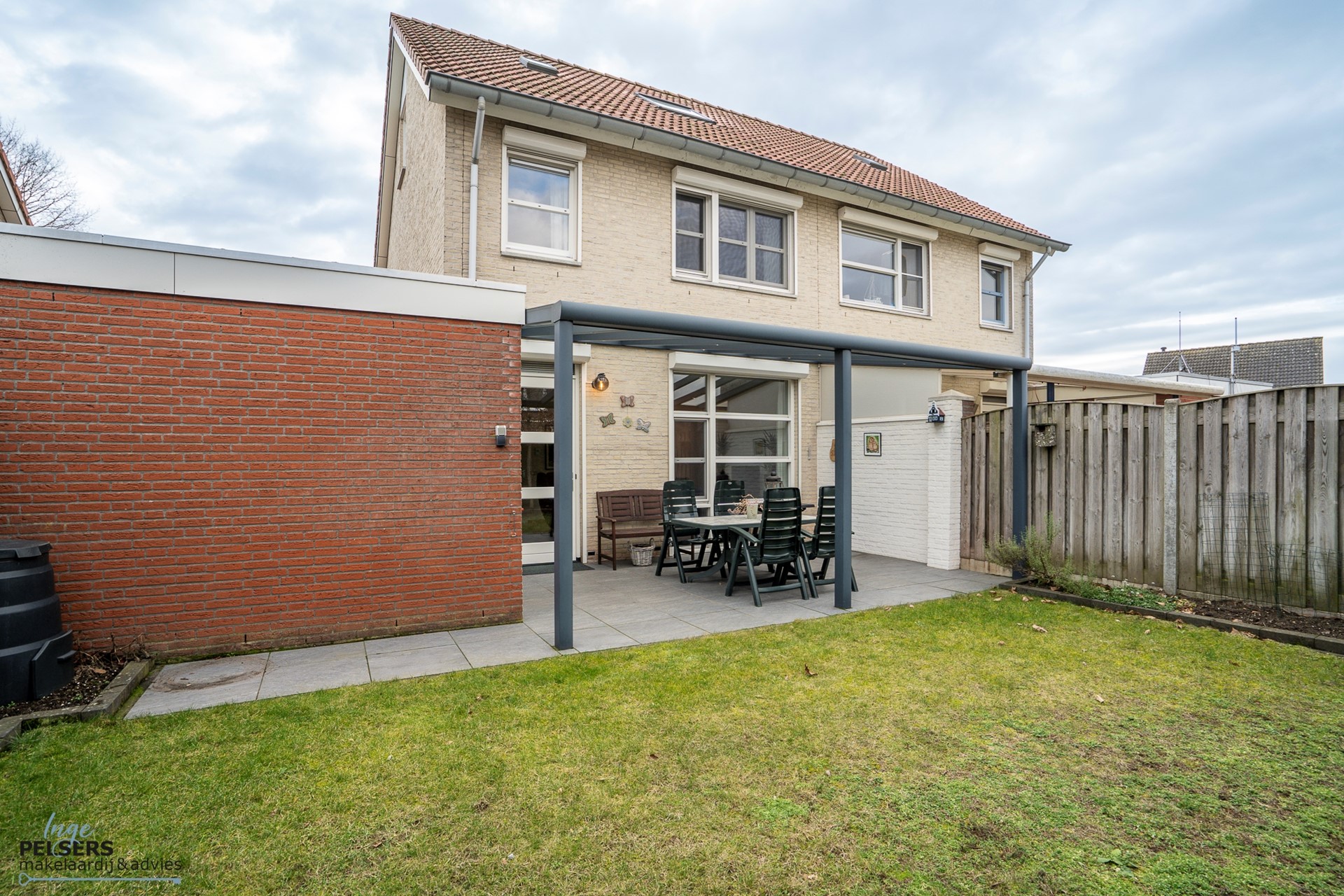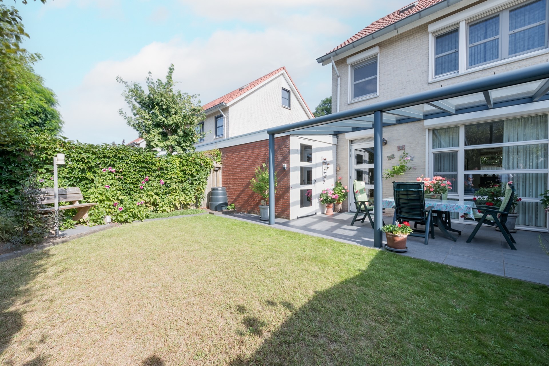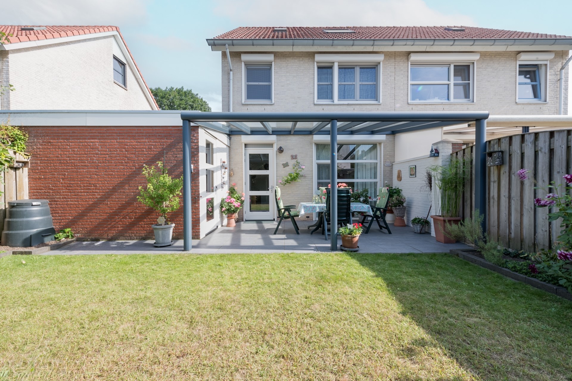 Het gazon en de terrasindeling zorgen voor een mooie balans tussen groen en gebruiksgemak.