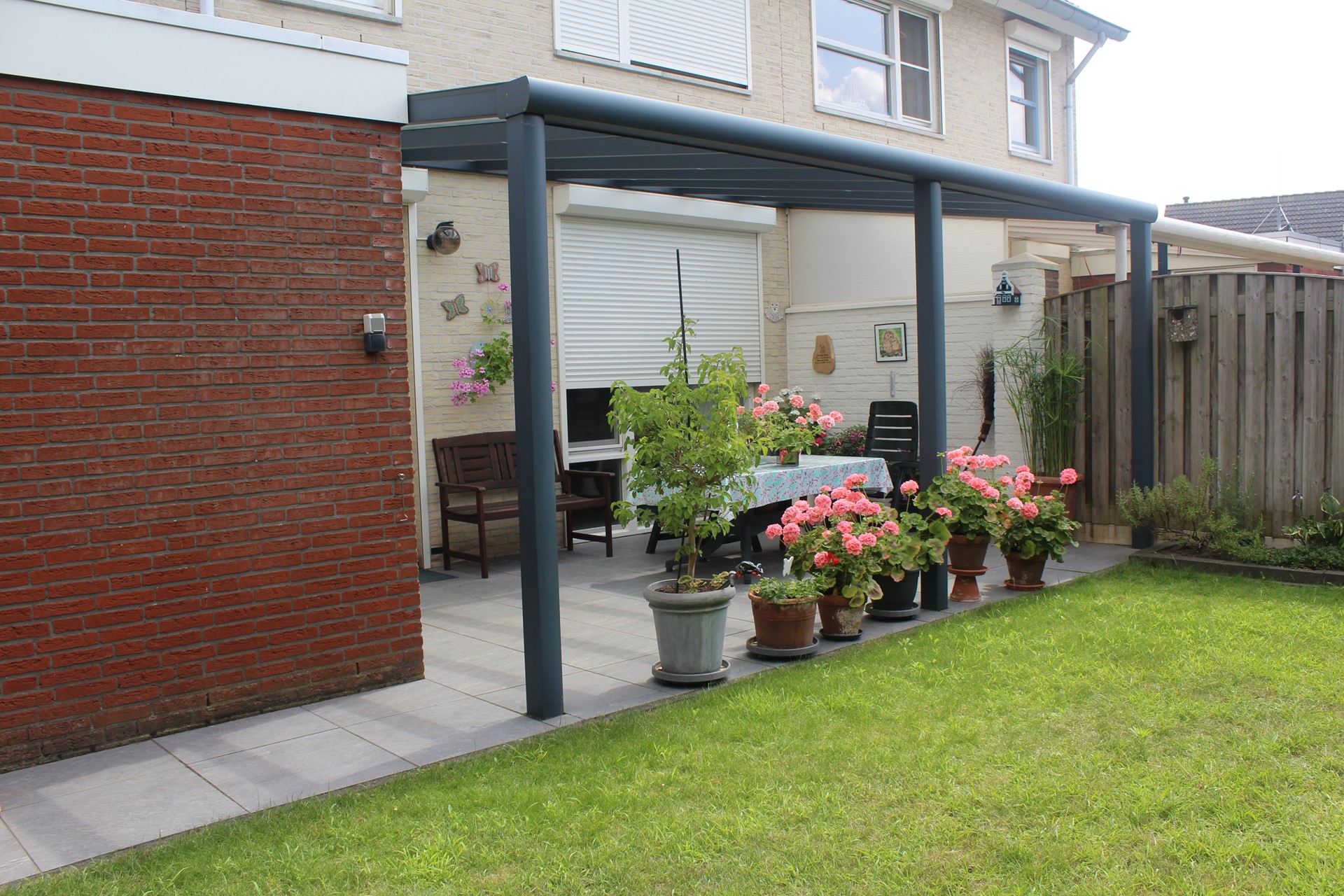 Onder de fraaie overkapping kun je het hele jaar door genieten van het buitenleven. Of je nu wilt genieten met een kop koffie in de ochtend, heerlijk eten met het gehele gezin of een gezellige barbecue met vrienden en familie, hier is alles denkbaar.