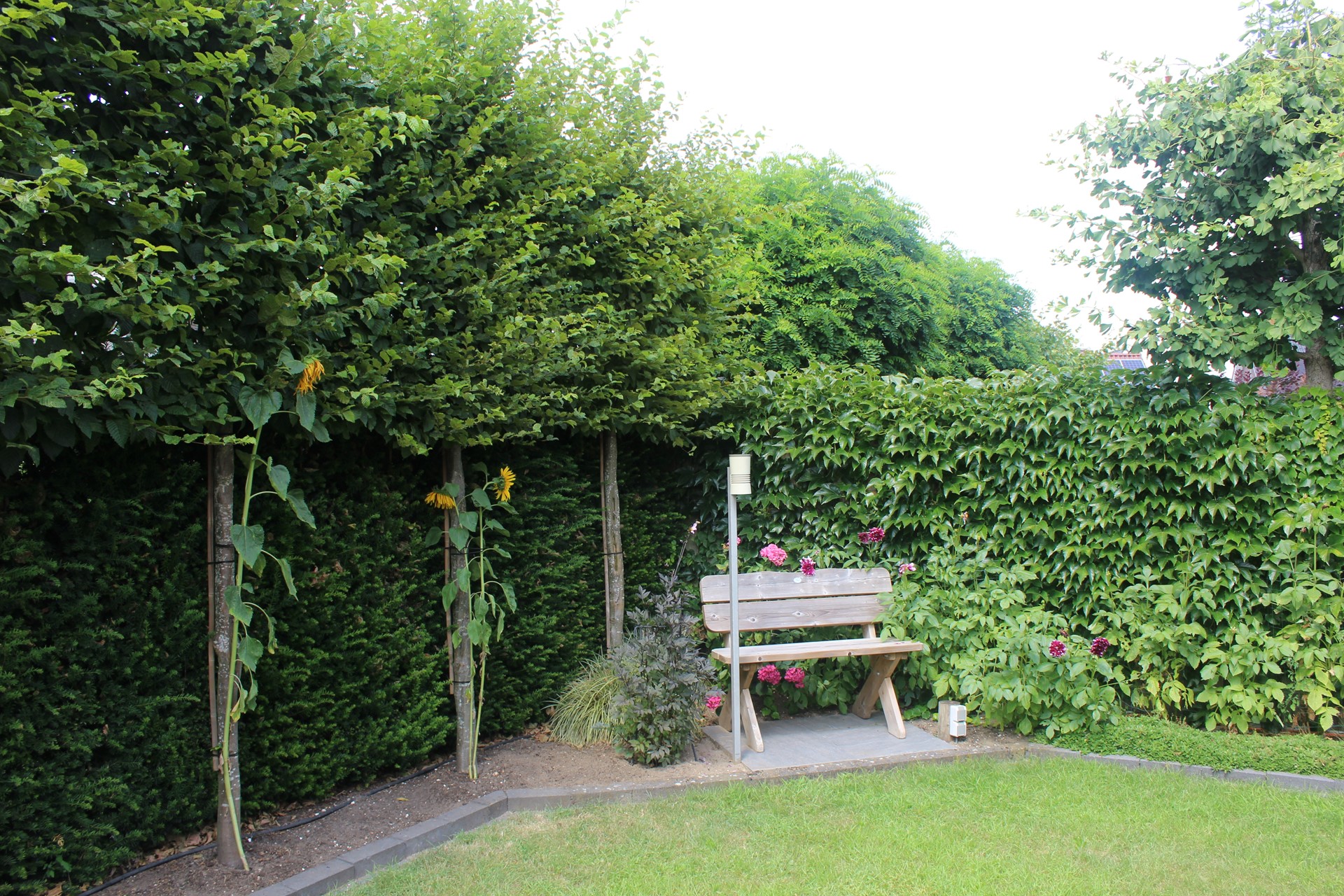 De achtertuin is gelegen op het noord-westen. Hier kun je heerlijk genieten van schaduw in de ochtend en van de zon in de middag en avond. Een ideale mix voor liefhebbers van schaduw in een tuin en voor zonaanbidders.