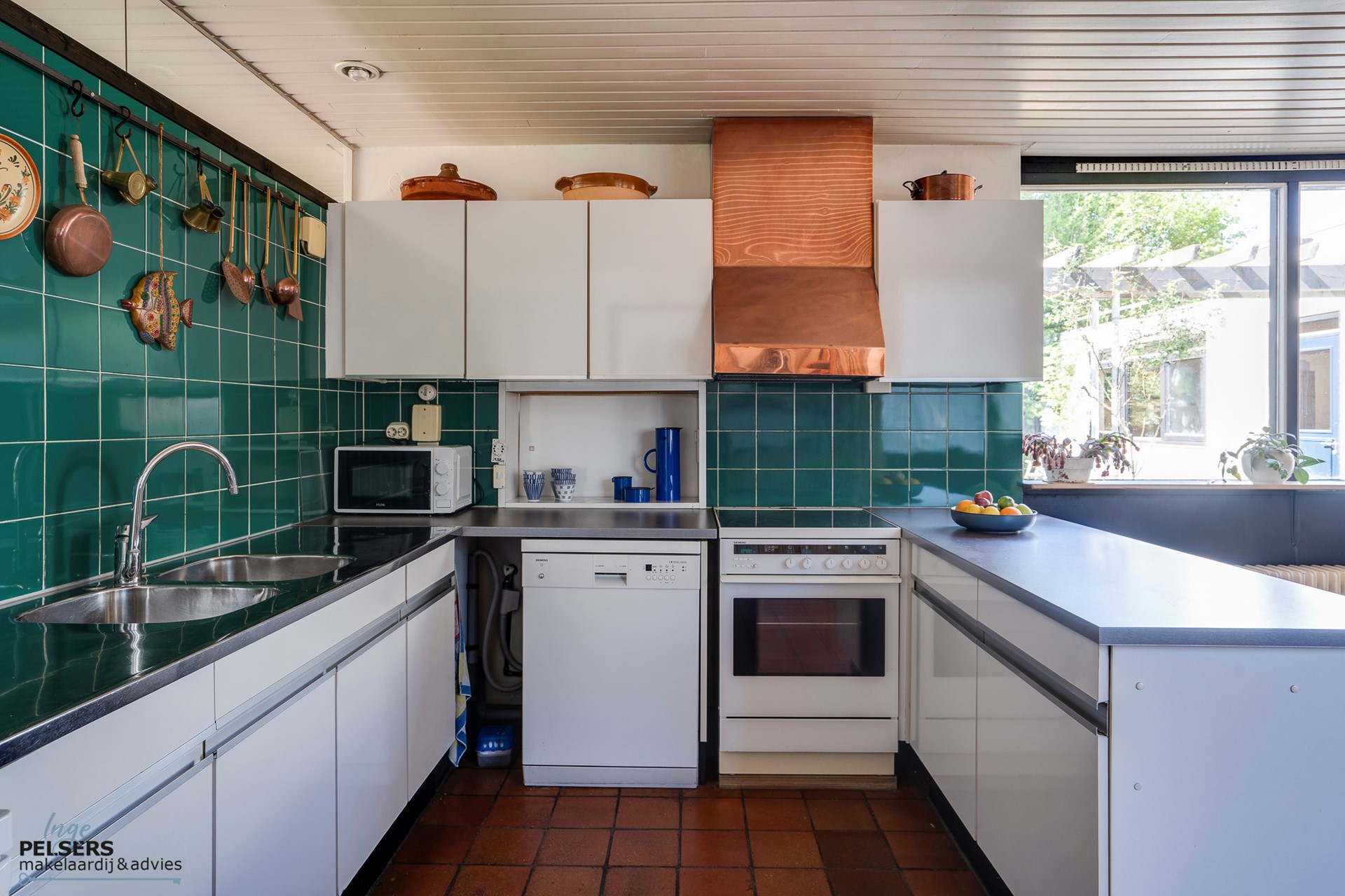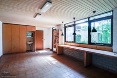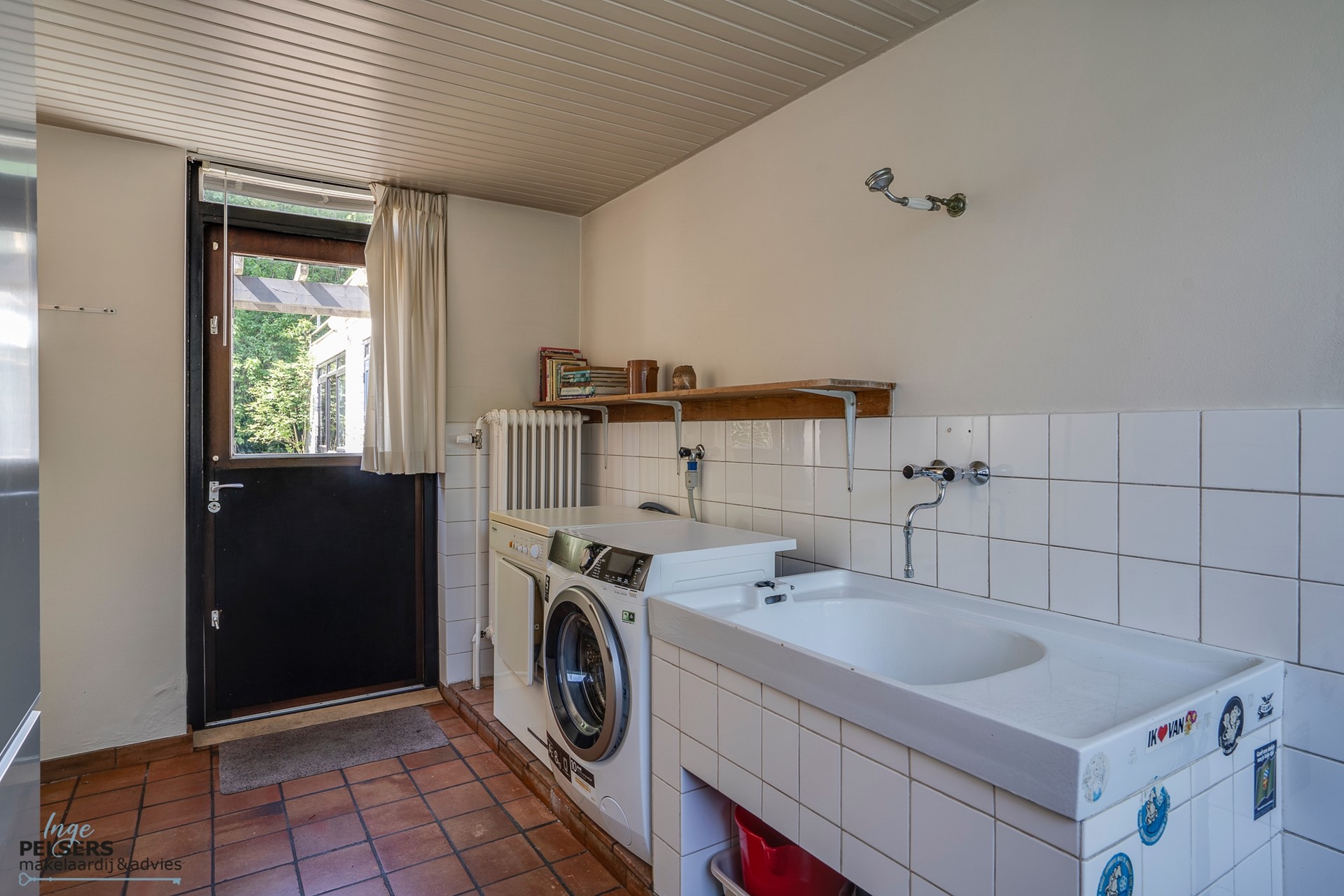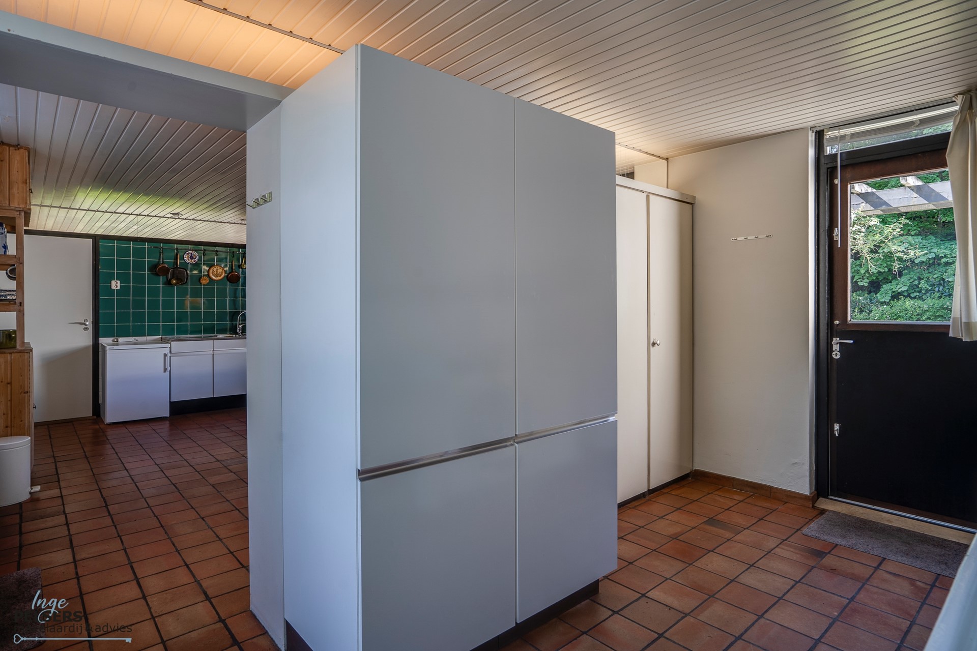 Aangrenzend aan de keuken is een grote bijkeuken met veel bergruimte. Momenteel is hier de witgoed opstelling en extra veel kastruimte. Vanuit de bijkeuken is toegang tot een van de aanwezige terrassen in de tuin en hier is eveneens toegang tot de garage.
