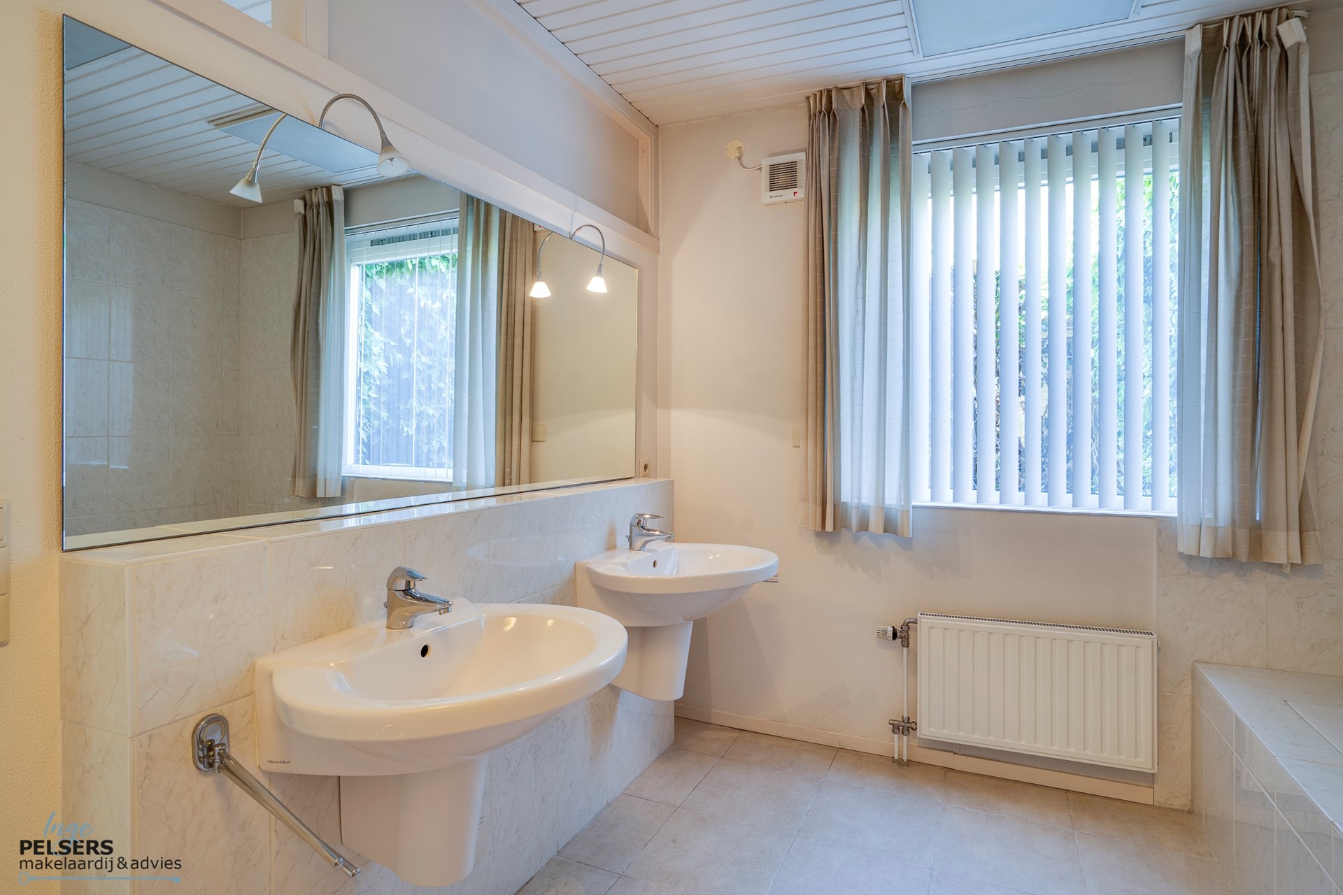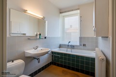 Deze badkamer is gemoderniseerd en is voorzien van dubbele wastafels, een ligbad en een inloopdouche. Behorende bij de badkamer is in het voorste gedeelte een toilet en bidet gesitueerd.