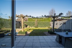 Vanaf de achterzijde van de woning, zowel vanuit de woonkamer als ook vanuit de keuken is er een optimaal tuincontact.