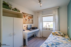 Op de eerste verdieping bevinden zich 4 slaapkamers, allen netjes afgewerkt en voorzien van veel lichtinval. De slaapkamers zijn voorzien van een laminaatvloer en voor comfort, privacy en veiligheid voorzien van rolluiken. De masterbedroom is uitgerust met een airco.