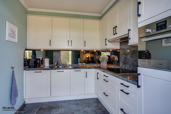 De halfopen keuken is neutraal van kleur en voorzien van luxe inbouwapparatuur, waaronder een combi-oven, kookplaat, koelkast en vaatwasser. Het granieten werkblad en bijpassende achterwand geven de keuken een moderne en tijdloze uitstraling.