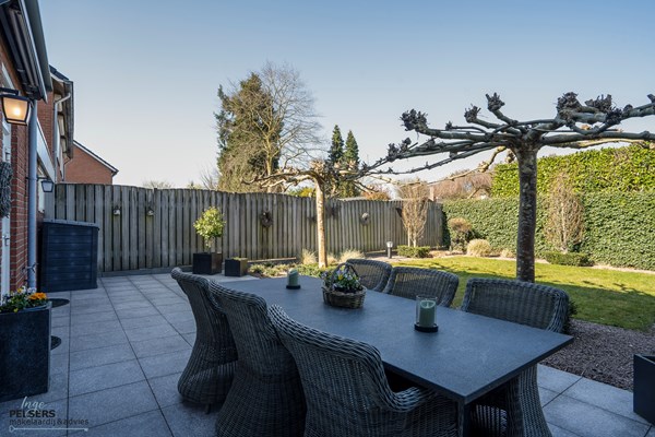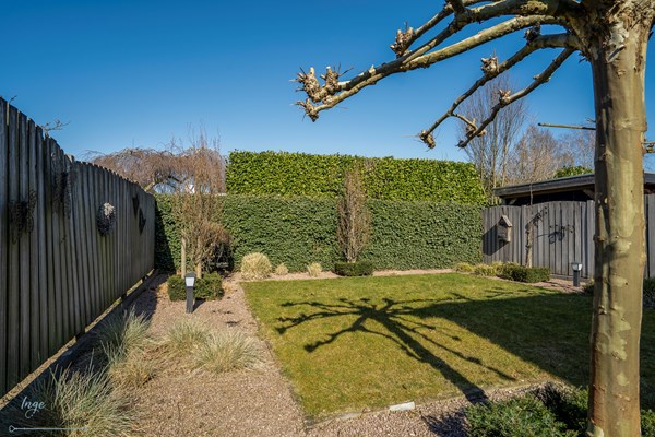 De achtertuin is volledig omheind, waardoor je hier in alle rust kunt genieten van het aanwezige groen, de mooie aangelegde borders en van de zon en natuurlijke schaduw.