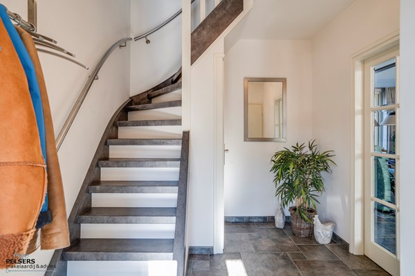 Bij binnenkomst word je verwelkomd in een ruime ontvangsthal, voorzien van een stijlvolle tegelvloer, garderobe en voldoende opbergruimte. Deze hal biedt toegang tot zowel de meterkast, het gastentoilet, de kelderkast met veel bergruimte, de woonkamer en tot de trapopgang naar de eerste verdiepingsvloer.