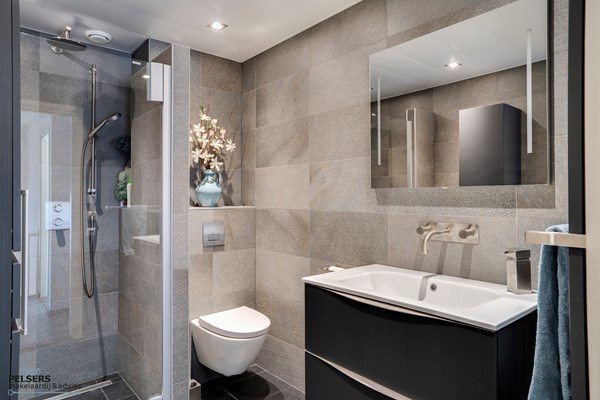 De moderne badkamer is uitgerust met een toilet, een inloopdouche, wastafelmeubel en designradiator, wat een plaatje!