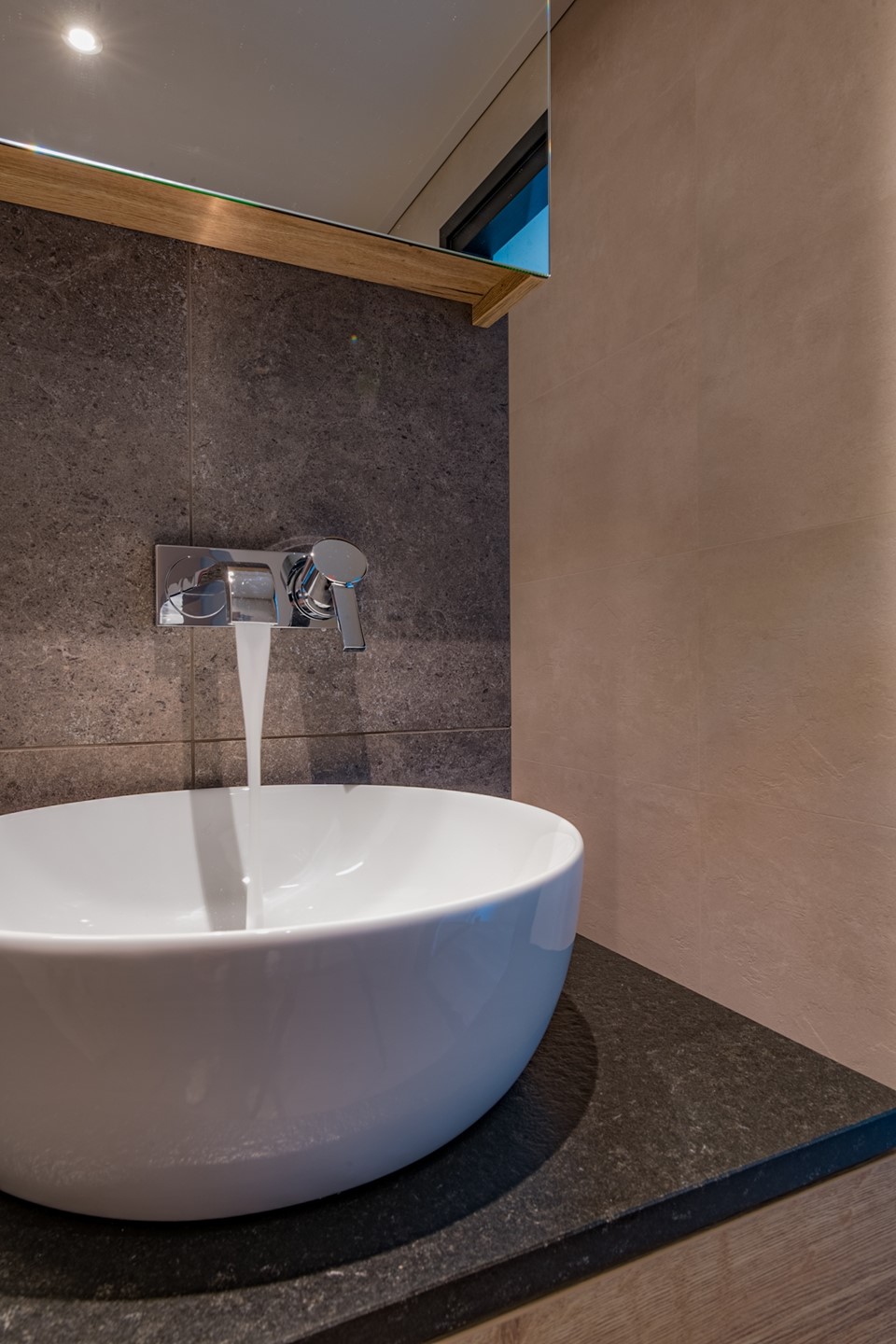 De badkamer is modern en stijlvol uitgevoerd en sluit perfect aan bij de rest van de woning. Een comfortabele en verzorgde ruimte waar je de dag prettig begint en ontspannen afsluit. Dubbele waskommen met gaaf meubel, een toilet en een ruime inloopdouche maken deze badkamer tot een plaatje.