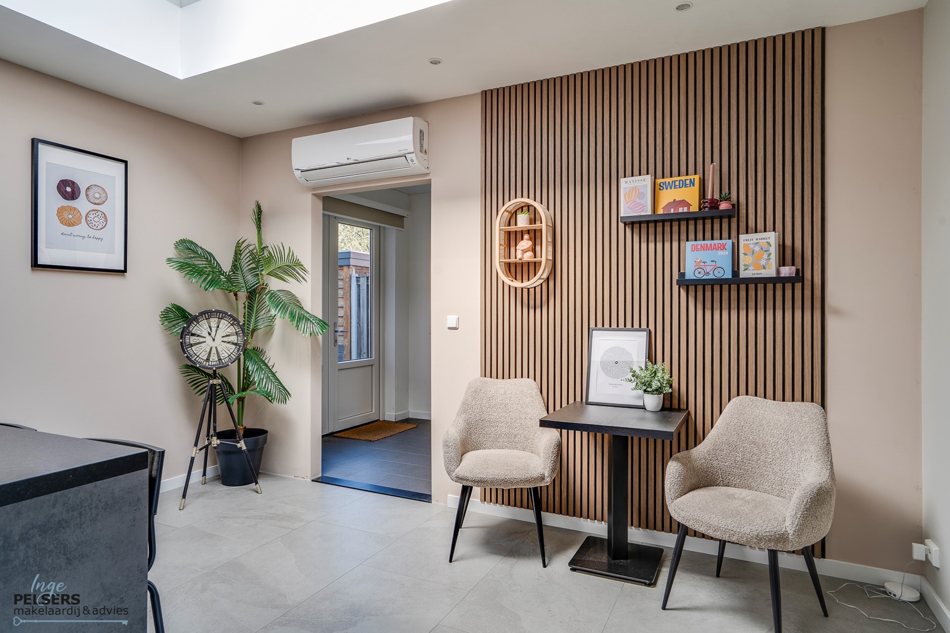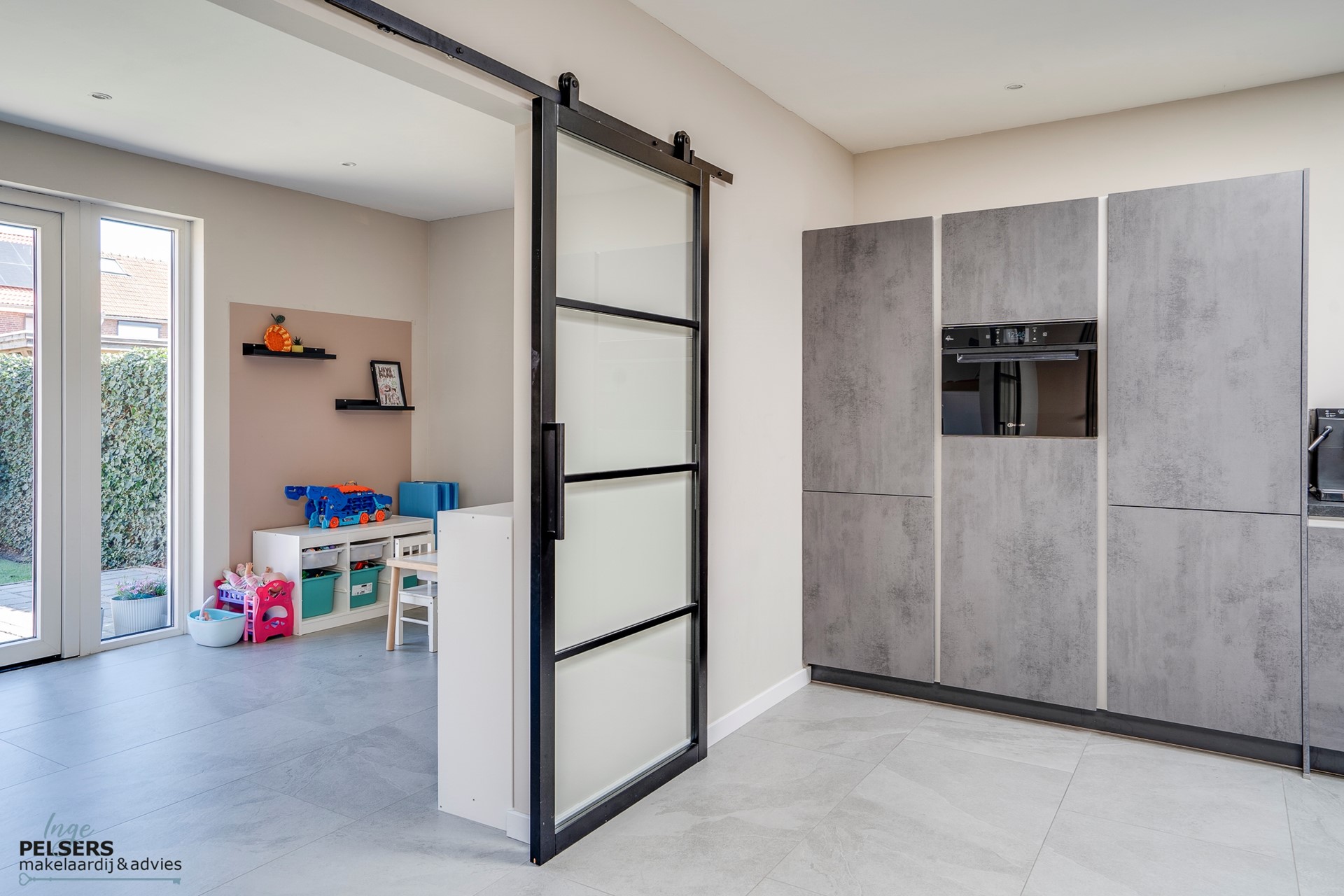 Meteen aan de keuken bevindt zich deze verrassende extra ruimte enkel gescheiden door een glazenwand (deuren ensuite) met aan de achterzijde van de kamer openslaande deuren naar de tuin.