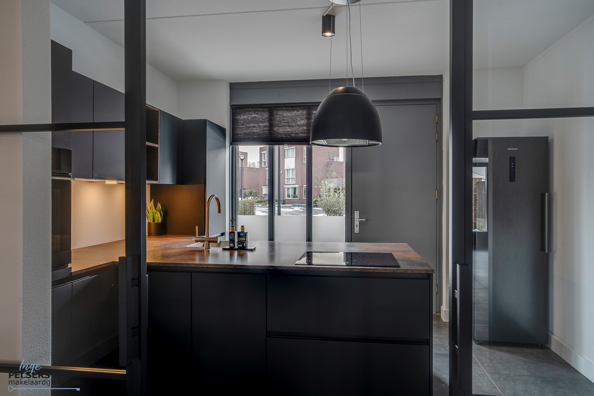De living heeft een semi-open verbinding met de prachtige keuken. Een grote glazen stalen taatsdeur vormt de afscheiding tussen woonkamer en keuken.