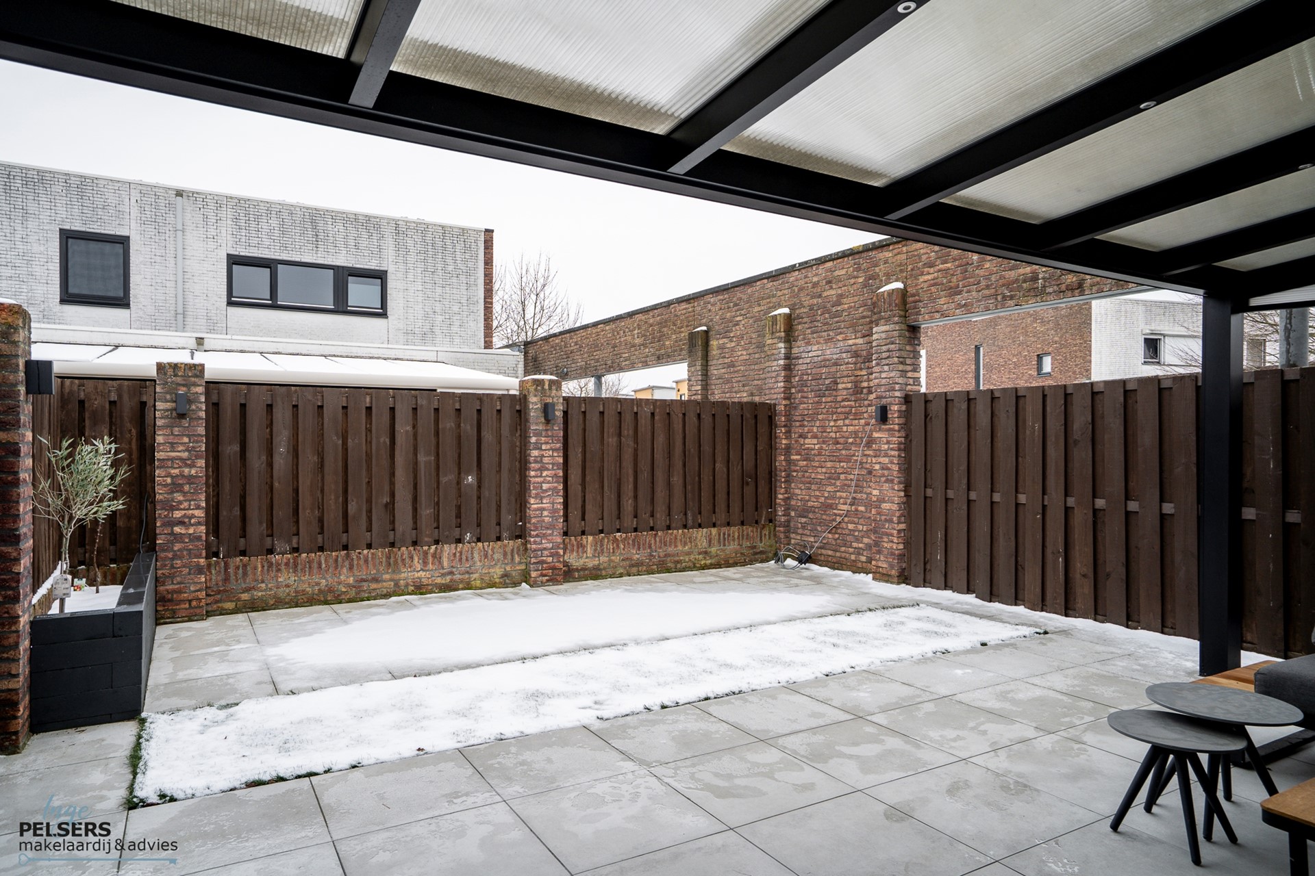 Door de ruime overkapping meteen aan het woonhuis is het hier heerlijk lang genieten van vroeg in het voorjaar tot lang in het najaar. Mooie aanwezige verlichting maakt de achtertuin geheel compleet.