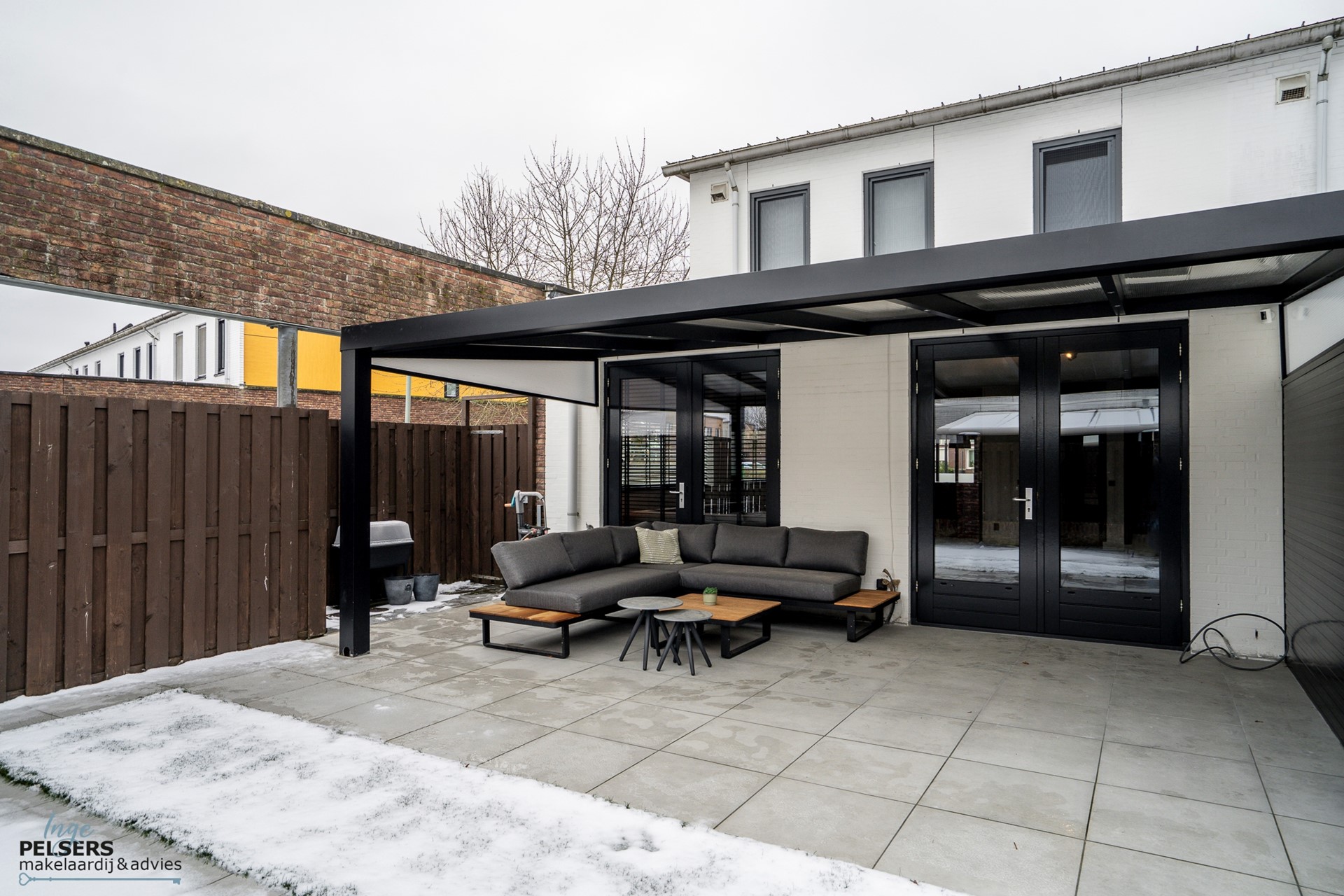 In de woonkamer aan de achterzijde zijn 2 grote openslaande deuren richting het overdekte terras. Dit ruime terrasligt meteen aangrenzend aan de verzorgde achtertuin.